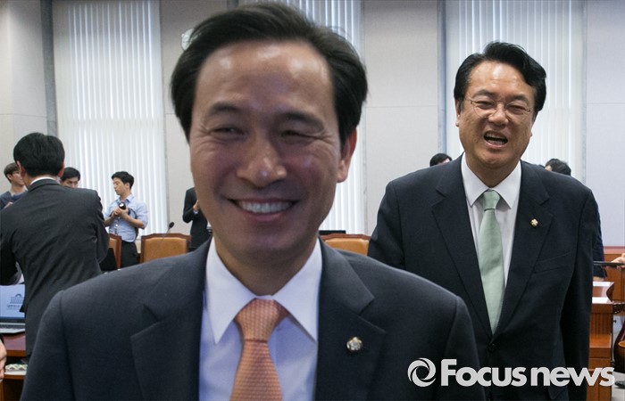 (서울=포커스뉴스) 6일 오후 서울 여의도 국회에서 운영위원회 전체회의를 마친 정진석(오른쪽) 새누리당 원내대표와 우상호 더불어민주당 원내대표가 이동하고 있다.
