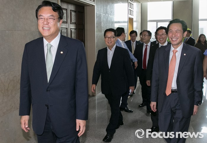 (서울=포커스뉴스) 6일 오후 서울 여의도 국회에서 운영위원회 전체회의를 마친 정진석(왼쪽) 새누리당 원내대표와 우상호(오른쪽) 더불어민주당 원내대표, 박지원 국민의당 원내대표가 이동하고 있다.