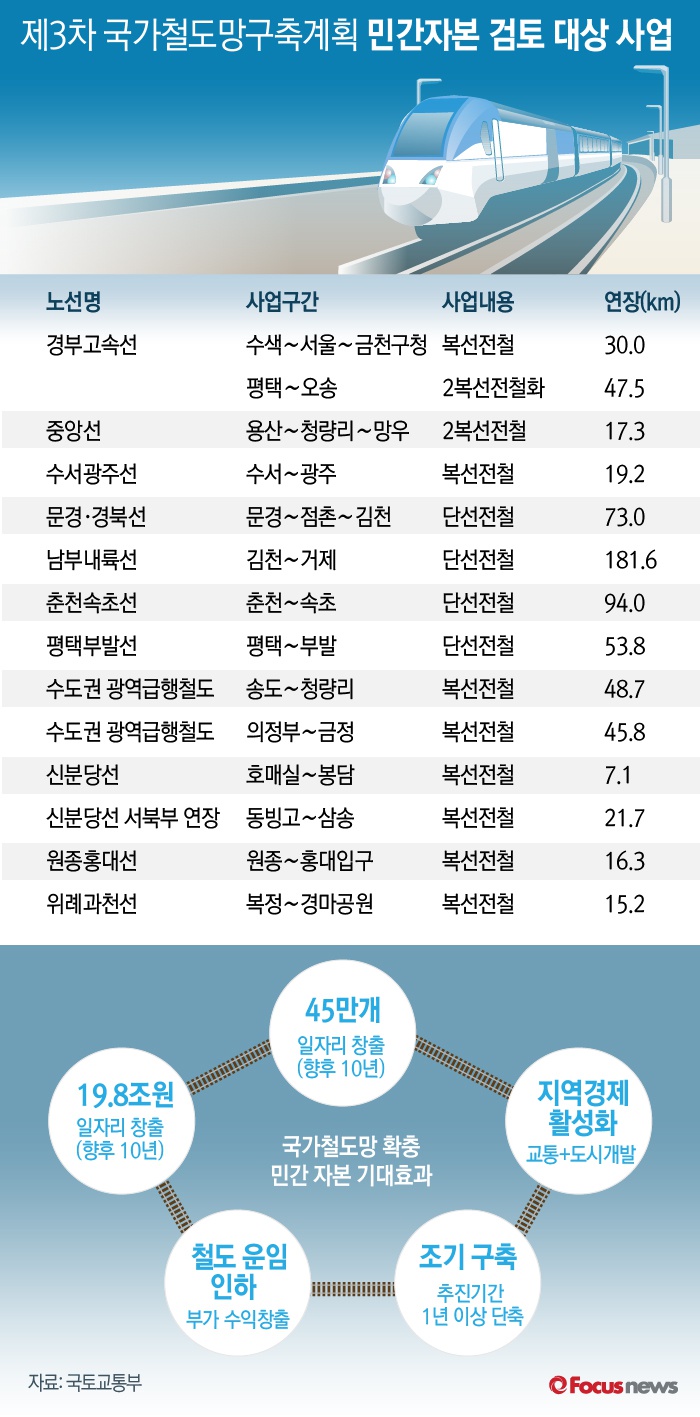 (서울=포커스뉴스) 국토교통부는 지난달 27일 확정한 ‘제3차 국가철도망계획’을 속도감 있게 추진하기 위해 6일 ‘민자철도사업 활성화 방안’을 상정·보고했다. 향후 10년간 민간자본 19조8000억 원 유치를 목표로 하고 있다.