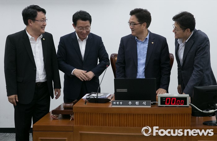 (서울=포커스뉴스) 6일 오후 서울 여의도 국회에서 가습기살균제 사고 진상규명과 피해구제 및 재발방지 대책마련을 위한 국정조사특별위원회 전체회의를 마친 우원식 위원장과 3당 간사가 취재진을 향해 포즈를 취하고 있다. 왼쪽부터 송기석 국민의당 간사, 김상훈 새누리당 간사, 우 위원장, 홍익표 더불어민주당 간사.