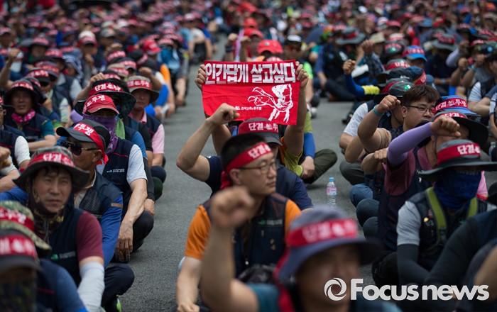 (서울=포커스뉴스) 전국건설노동조합 조합원들이 6일 오후 서울역광장에서 총파업 집회에 앞서 건설사 직접 시공제 도입 등 18대 대정부 요구안 제시를 촉구하는 구호를 외치고 있다.