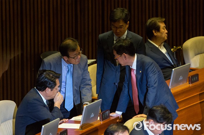 (서울=포커스뉴스) 원혜영(왼쪽 두 번째) 더불어민주당 의원 6일 오후 서울 여의도 국회에서 열린 '제343회 국회(임시회) 제8차 본회의'에 참석해 정진석(왼쪽) 새누리당 원내대표, 김도읍(오른쪽) 새누리당 원내수석부대표와 대화 하고 있다.