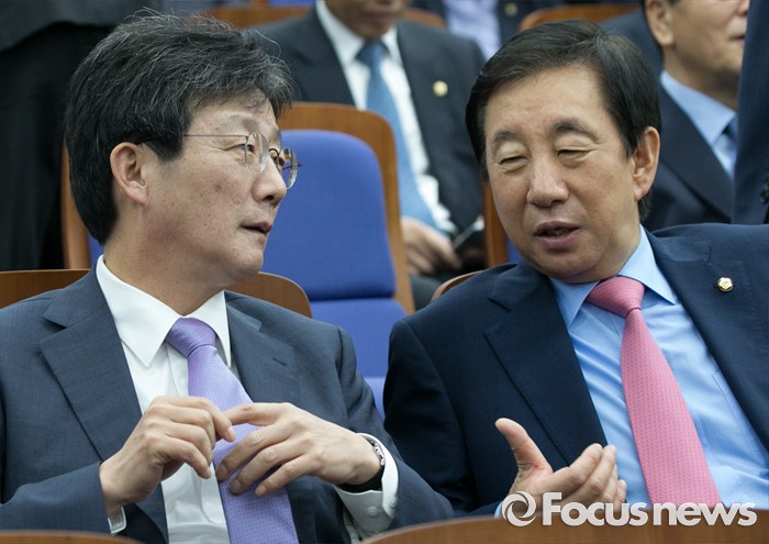 (서울=포커스뉴스) 6일 오후 서울 여의도 국회에서 열린 새누리당 의원총회에 참석한 유승민(왼쪽), 김성태 의원이 대화하고 있다.