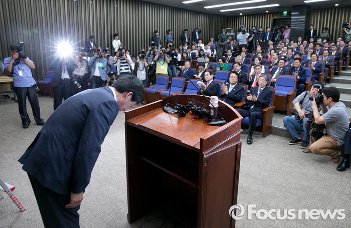 (서울=포커스뉴스) 6일 오후 서울 여의도 국회에서 열린 새누리당 의원총회에 참석한 유승민 의원이 복당 인사말을 마친 뒤 인사하고 있다.