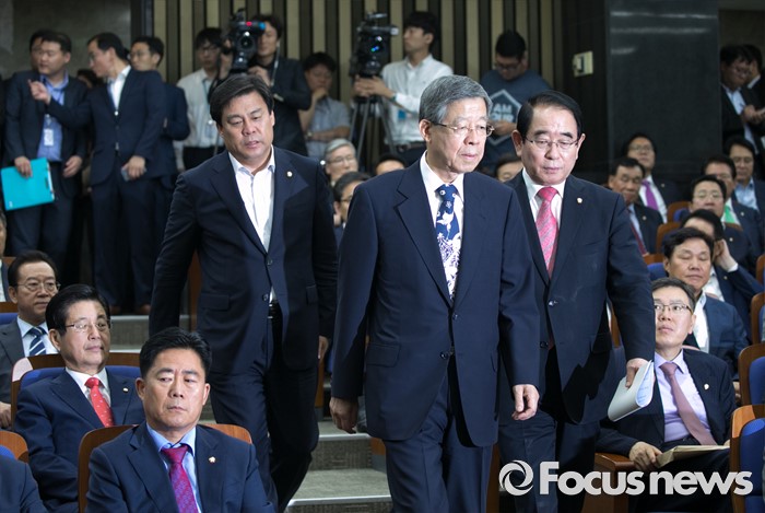(서울=포커스뉴스) 6일 오후 서울 여의도 국회에서 열린 새누리당 의원총회에 김희옥(가운데) 혁신비대위원장과 박명재(오른쪽) 사무총장이 참석하고 있다.