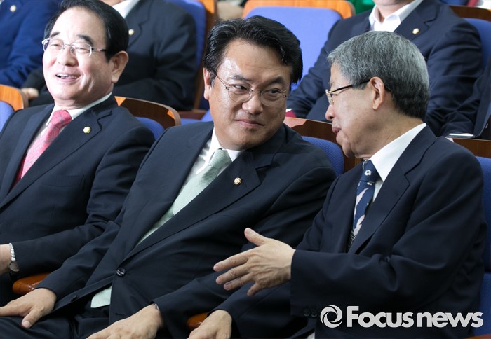(서울=포커스뉴스) 6일 오후 서울 여의도 국회에서 열린 새누리당 의원총회에 참석한 김희옥(오른쪽) 혁신비대위원장과 정진석(가운데) 원내대표, 박명재 사무총장이 복당 의원들의 인사말을 들으며 대화하고 있다.