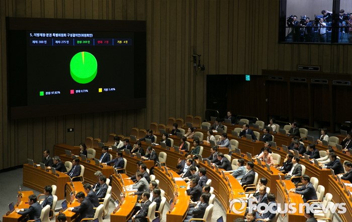 (서울=포커스뉴스) 6일 오후 서울 여의도 국회에서 열린 343회 국회(임시회) 8차 본회의에서 지방재정·분권 특별위원회 구성결의안이 재석 275인 중 찬성 269인, 반대 2인, 기권 4인으로 통과되고 있다.