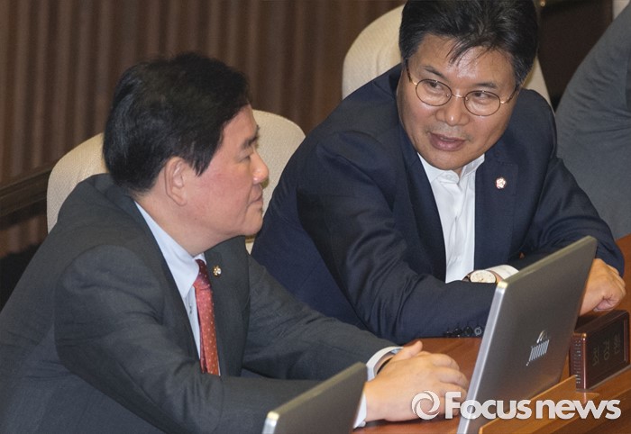 (서울=포커스뉴스) 6일 오후 서울 여의도 국회에서 열린 343회 국회(임시회) 8차 본회의에 참석한 최경환(왼쪽), 홍문종 새누리당 의원이 대화하고 있다.
