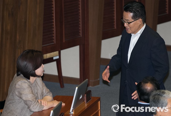 (서울=포커스뉴스) 6일 오후 서울 여의도 국회에서 열린 343회 국회(임시회) 8차 본회의에 참석한 심상정(왼쪽) 정의당 상임대표와 박지원 국민의당 원내대표가 대화하고 있다.