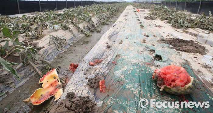 (부여=포커스뉴스) 6일 오후 집중호우로 수해를 입은 충남 부여 정동리 수박 비닐하우스에서 농작물이 말라죽어 있다. 이날 이동필 농림축산식품부 장관은 농작물 수해지역과 농민의 애로사항을 점검했다.