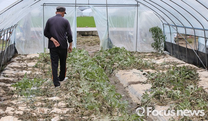 (부여=포커스뉴스) 6일 오후 집중호우로 수해를 입은 충남 부여 정동리 수박 비닐하우스에서 농민이 피해를 입은 농작물 사이로 걷고 있다. 이날 이동필 농림축산식품부 장관은 농작물 수해지역과 농민의 애로사항을 점검했다.
