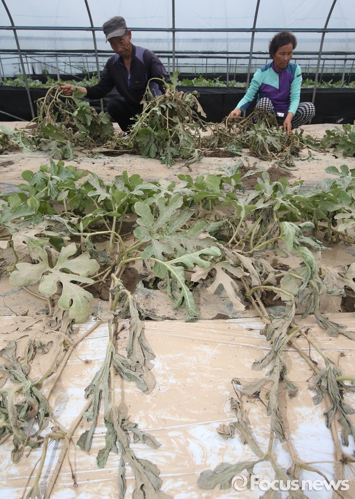 (부여=포커스뉴스) 6일 오후 집중호우로 수해를 입은 충남 부여 정동리 수박 비닐하우스에서 농민이 피해를 입은 농작물을 거두고 있다. 이날 이동필 농림축산식품부 장관은 농작물 수해지역과 농민의 애로사항을 점검했다.