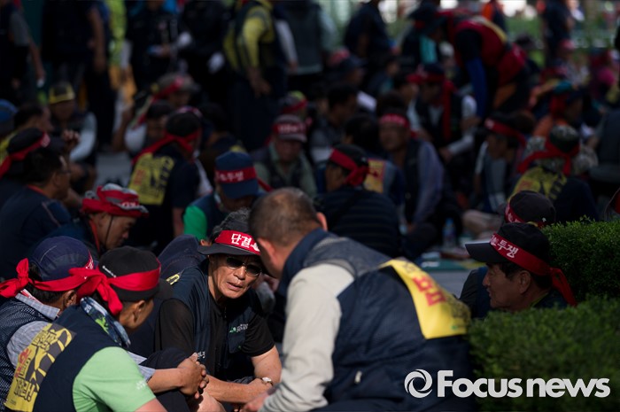 (서울=포커스뉴스) 6일 오후 서울 중구 서울시청광장에서 열린 '건설노동자 총력투쟁 결의대회'에 참석한 조합원들이 광장 인근에서 휴식을 취하고 있다.