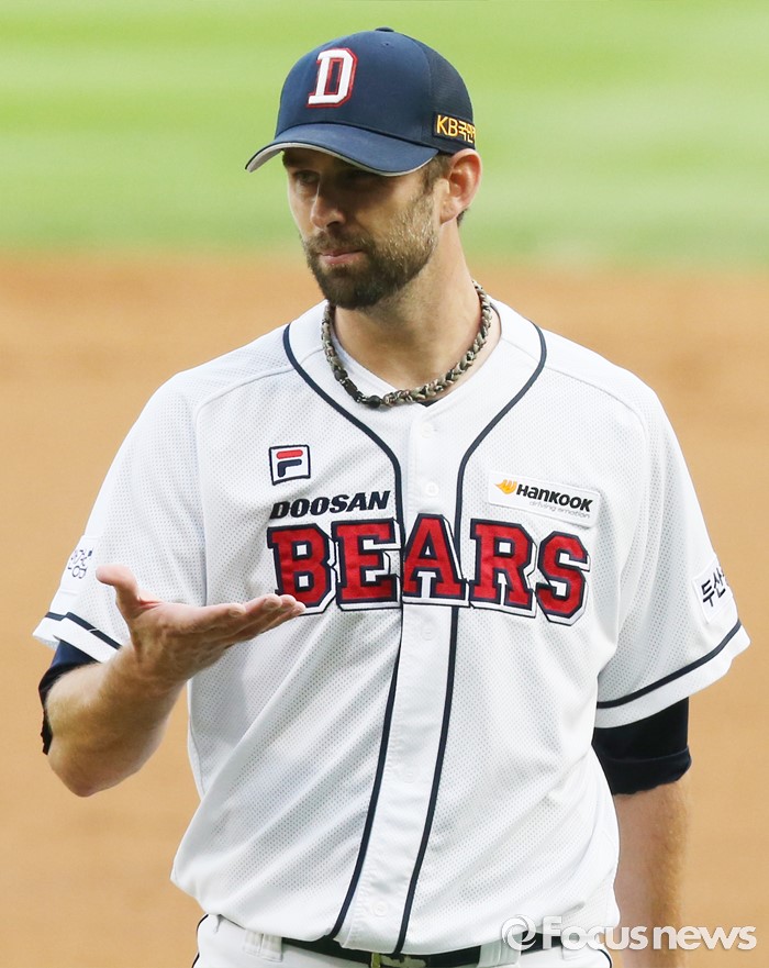 (서울=포커스뉴스) 6일 서울 잠실구장에서 열린 2016 프로야구 넥센-두산 경기에서 두산 투수 니퍼트가 2회 수비를 마치고 포수 양의지에게 자신의 투구에 대해 묻고 있다.