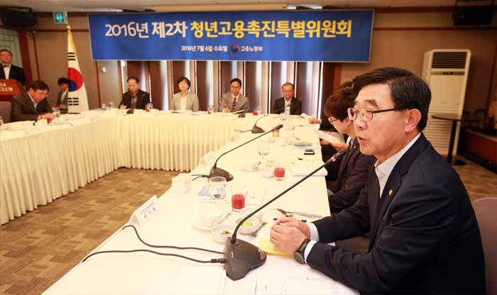 (서울=포커스뉴스) 이기권 고용노동부 장관이 6일 오전 서울 중구 세종대로 프레스센터에서 열린 2016년 제2차 청년고용촉진특별위원회 회의에서 참석자들과 인사 후 모두발언을 하고 있다. <사진제공=고용노동부>