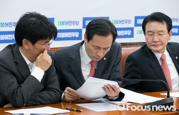 (서울=포커스뉴스) 7일 오전 서울 여의도 국회에서 열린 더불어민주당 정책조정회의에 참석한 우상호(가운데) 원내대표와 변재일(오른쪽) 정책위의장, 박완주 원내수석부대표가 대화하고 있다.
