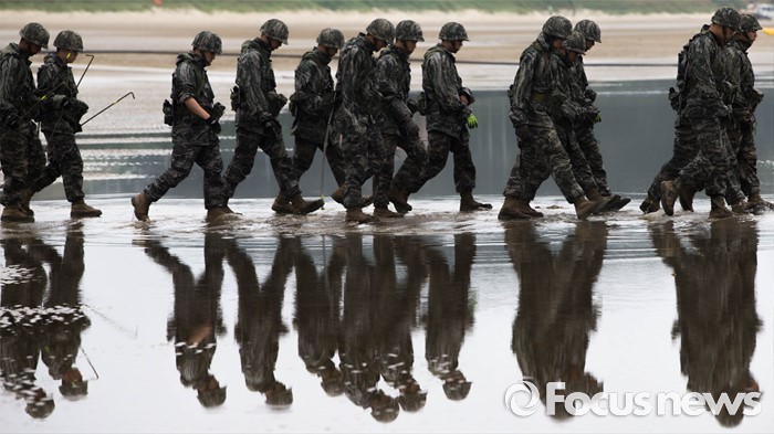 | △ 바다를 걸어 훈련장 향하는 해병대 |
