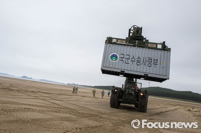 (태안=포커스뉴스) 7일 오전 충청남도 태안군 안면읍 인근 해안에서 2016 합동 해안양륙군수지원(J LOTS) 훈련이 열리고 있다. 합동참모본부 주관으로 해군과 해병대, 육군, 해경이 참가하는 합동 해안양륙군수지원 훈련은 항만 사용이 불가한 지역에서 작전을 수행중인 전투부대에 군수지운을 하기 위한 작전이다.