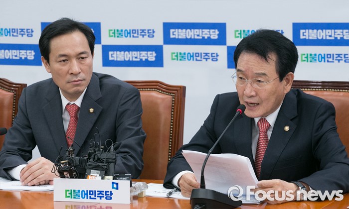 (서울=포커스뉴스) 7일 오전 서울 여의도 국회에서 열린 더불어민주당 정책조정회의에 참석한 변재일 정책위의장이 발언하고 있다. 왼쪽은 우상호 원내대표.