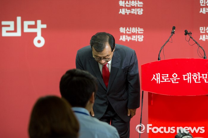 (서울=포커스뉴스) 이정현 새누리당 의원이 7일 오전 서울 여의도 새누리당사에서 오는 8월 당 대표를 선출하는 전당대회에 후보로 출마하겠다는 가지회견에 앞서 인사 하고 있다.