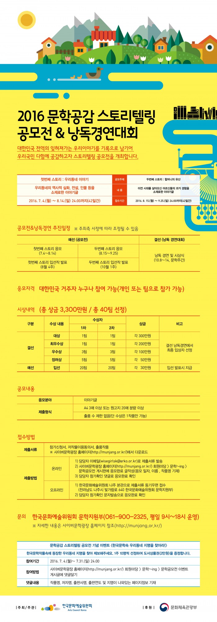 대한민국 거주자 누구나 응모할 수 있다. 출품작은 이메일 또는 우편으로 가능하다. 응모된 작품에 대해서는 외부전문가로 구성된 심사위원회의 입선작 심사를 거친 뒤 10월 열리는 '2016 문학주간' 행사 중 낭독경연대회를 통해 최종 수상자를 선정한다. 총 40팀에게 총상금 3300만원을 준다.한국문화예술위원회 주최 '2016 문학공감 스토리텔링 공모전' 공식 포스터 <사진제공=한국문화예술위원회>