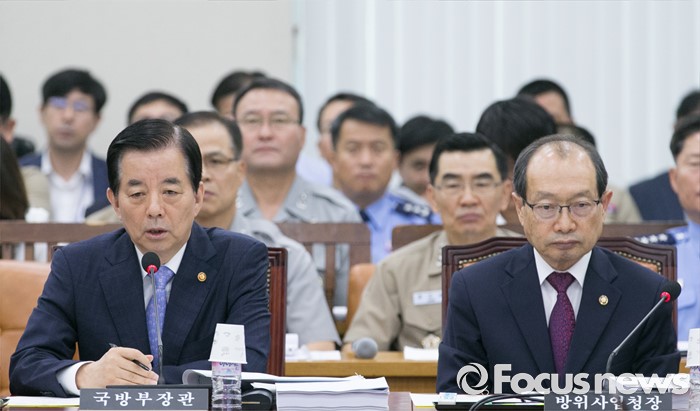 (서울=포커스뉴스) 7일 오전 서울 여의도 국회에서 열린 국방위원회 전체회의에 참석한 한민구 국방부 장관이 의원들의 질의에 답하고 있다. 오른쪽은 장명진 방위사업청장.