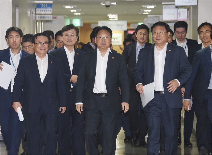 | △ 브리핑장 향하는 유일호 부총리 |