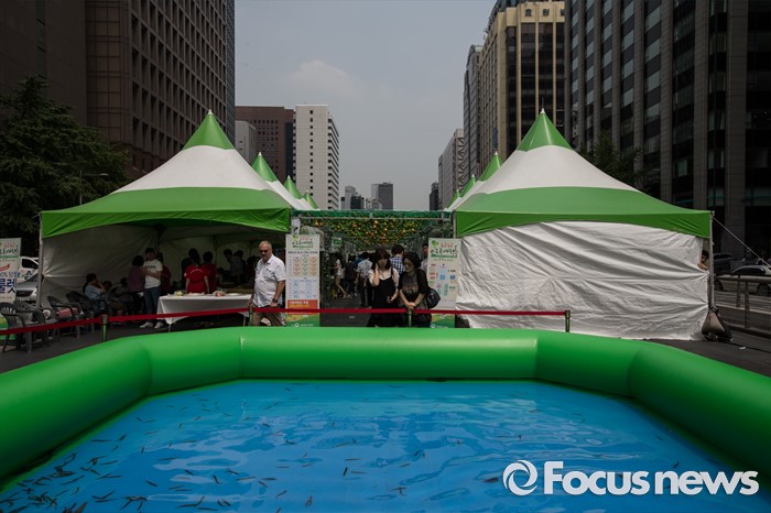 (서울=포커스뉴스) 7일 오후 서울 종로구 청계천 광장에서 열린 '2016 도시 농촌 교류의 날 및 농촌여름휴가 캠페인'에 미꾸라지 잡기 체험부스가 마련되어 있다.