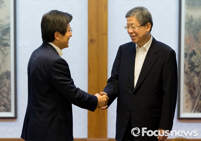 (서울=포커스뉴스) 7일 오후 서울 종로구 삼청동 국무총리공관에서 열린 당·정·청 정책조정협의회에서 황교안(왼쪽) 국무총리와 김희옥 새누리당 혁신비상대책위원장이 인사를 나누고 있다.
