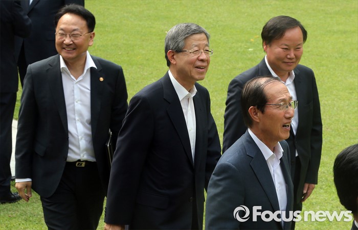 (서울=포커스뉴스) 7일 오후 서울 종로구 삼청동 국무총리공관에서 열린 당·정·청 정책조정협의회에서 이원종 청와대 비서실장, 김희옥 새누리당 비상대책위원회 위원장, 유일호 경제부총리, 김재원 정무수석 등이 회의장으로 향하고 있다.