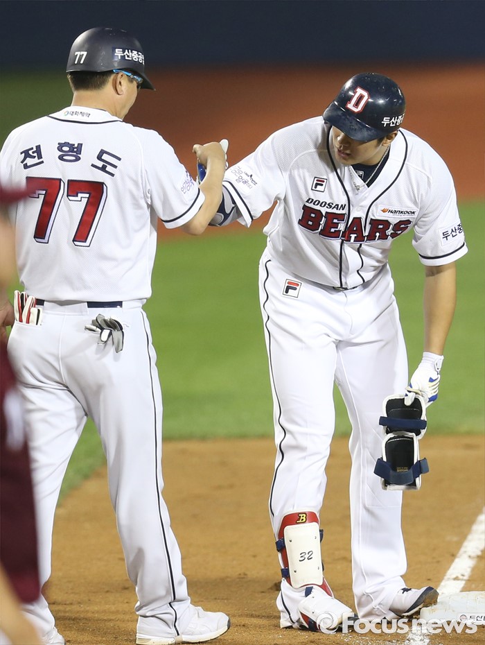 (서울=포커스뉴스) 6일 서울 잠실구장에서 열린 2016 프로야구 넥센-두산 경기 6회말 무사 1루에서 두산 김재환이 우중간 3루타를 치고 전형도 코치의 축하를 받고 있다.
