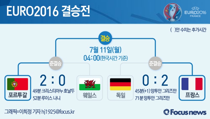 (서울=포커스뉴스) 개최국 프랑스가 독일을 2-0으로 꺾고 결승에 진출했다. 이로써 유로2016 우승의 향방은 포르투갈 대 프랑스의 대결로 압축됐다. 유로2016 결승전은 한국시간으로 11일(월) 오전 4시에 치러진다.