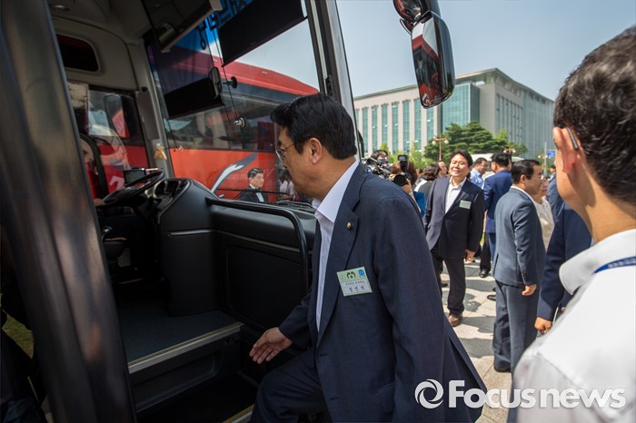 (서울=포커스뉴스) 박근혜 대통령과 새누리당 의원들의 오찬이 예정되있는 8일 오전 서울 여의도 국회에서 정진석 새누리당 원내대표가 청와대로 이동하는 버스에 탑승 하고 있다.