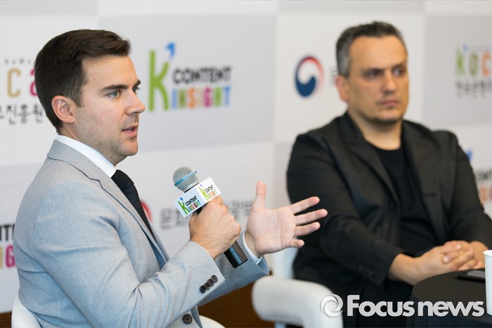 (서울=포커스뉴스) '캡틴 아메리카:시빌워' 조 루소(Joe Russo)(오른쪽) 감독과 영화사 불릿의 토드 마커리스(Todd Makurath) 대표가 8일 오전 서울 마포구 누리꿈스퀘어에서 열린 제2차 콘텐츠 인사이트 기자간담회에 참석해 취재진 질문에 답변하고 있다.