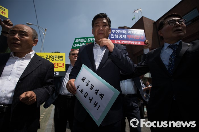 (서울=포커스뉴스) 한국자영업자총연대 등 소상공인 단체가 8일 오전 서울 종로구 청운효자동주민센터 앞에서 '부정청탁 및 금품 등 수수의 금지에 관한 법률(김영란법)' 시행저지 기자회견을 열고 최승재 소상공인연합회장(가운데)이 대통령에게 전하는 호소문을 들고 청와대를 향하고 있다.