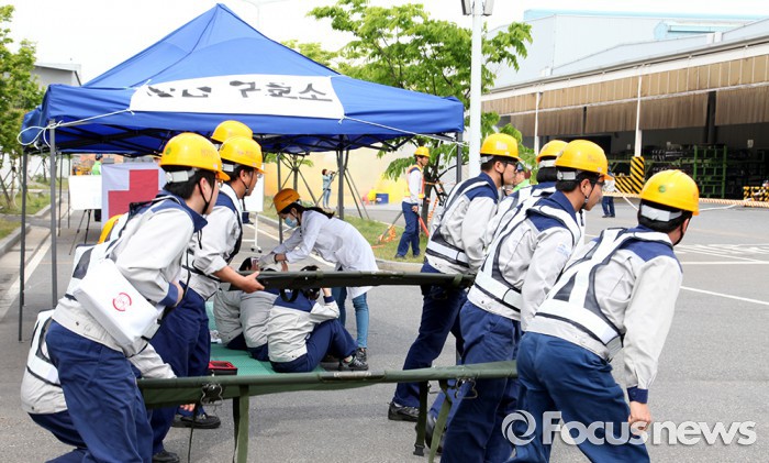 또한 두산인프라코어는 2011년부터 협력사의 안전보건 수준 향상을 위해 사고예방 지원 활동을 펼쳐왔다. 2012년부터는 고용노동부 주관의 공생협력 프로그램에 참여해 체계적인 지원 시스템을 갖췄다.두산인프라코어 군산공장에서 비상사태 대응훈련을 하는 모습. <사진제공=두산인프라코어>