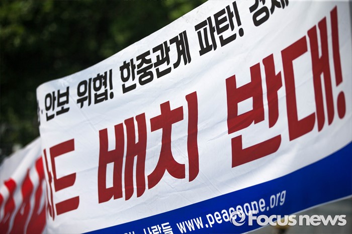 (서울=포커스뉴스) 국방부가 사드의 한국 배치를 결정한 8일 오후 서울 용산구 국방부 앞에서 사드 한국 배치를 규탄하는 평화와 통일을 여는 사람들 관계자들의 시위가 열리고 있다.