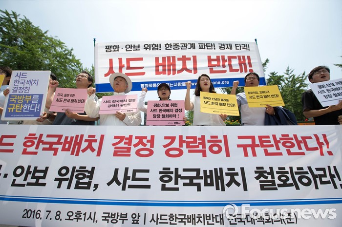 (서울=포커스뉴스) 국방부가 사드의 한국 배치를 결정한 8일 오후 서울 용산구 국방부 앞에서 사드 한국 배치를 규탄하는 평화와 통일을 여는 사람들 관계자들의 시위가 열리고 있다.