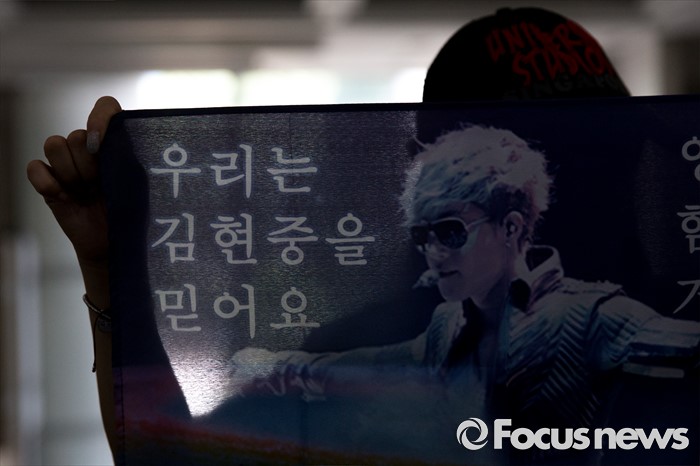 (서울=포커스뉴스) 8일 오후 서울중앙지방법원에서 전 여자친구와 민사소송 중인 가수 김현중의 홍콩, 일본, 중국 팬들이 김현중을 응원하는 손피켓을 들고 있다.