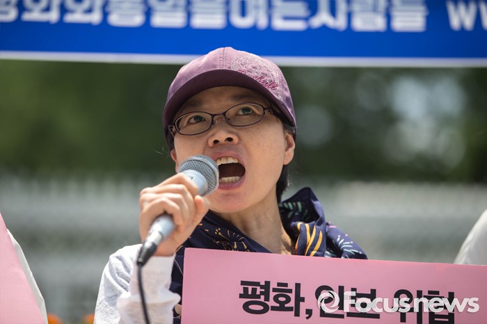 (서울=포커스뉴스) 국방부가 사드의 한국 배치를 결정한 8일 오후 서울 용산구 국방부 앞에서 사드 한국 배치를 규탄하는 평화와 통일을 여는 사람들 관계자들의 시위가 열리고 있다.