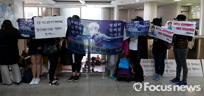 (서울=포커스뉴스) 8일 오후 서울중앙지방법원에서 전 여자친구와 민사소송 중인 가수 김현중의 홍콩, 일본, 중국 팬들이 김현중을 응원하는 손피켓을 들고 있다.