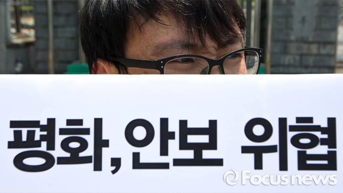 (서울=포커스뉴스) 국방부가 사드의 한국 배치를 결정한 8일 오후 서울 용산구 국방부 앞에서 사드 한국 배치를 규탄하는 평화와 통일을 여는 사람들 관계자들의 시위가 열리고 있다.