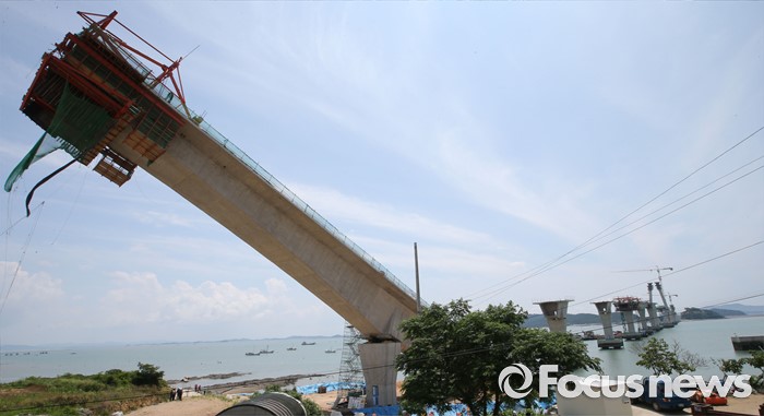 (영광=포커스뉴스) 8일 오전 전남 영광군 염산면과 무안군 해제면을 잇는 칠산대교 건설현장에서 상판 구조물이 무너져 노동자 6명이 부상을 입는 사고가 발생, 칠산대교는 가운데 교각을 중심으로 상판이 한쪽으로 기울듯 무너져 내려 있다.