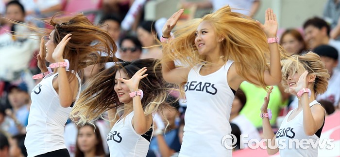 (서울=포커스뉴스) 폭염주의보가 네려진 무더운 8일 저녁 서울 잠실구장에서 열린 2016 프로야구 KIA-두산 경기에서 두산 치어리더가 더위를 날려버릴 시원한 복장으로 졍열적인 춤을 추며 팬들의 이목을 집중시키고 있다.