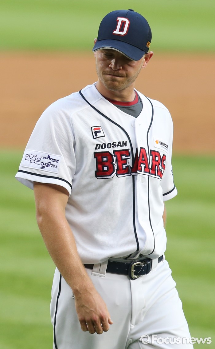 (서울=포커스뉴스) 8일 서울 잠실구장에서 열린 2016 프로야구 KIA-두산 경기에서 두산 투수 보우덴이 실망한 표정을 지으며 덕아웃으로 향하고 있다.