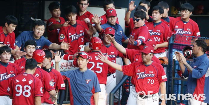 (서울=포커스뉴스) 8일 서울 잠실구장에서 열린 2016 프로야구 KIA-두산 경기 1회초 2사 1루에서 KIA 이범호가 좌월 2점 홈런을 치고 덕아웃에서 동료들의 축하를 받고 있다.