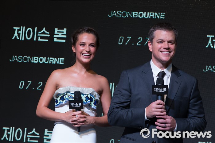 (서울=포커스뉴스) 8일 오후 서울 영등포구 타임스퀘어에서 열린 영화 '제이슨 본' 레드카펫 행사에 참석한 배우 알리시아 비칸데르(왼쪽)과 맷더이먼이 웃고 있다.