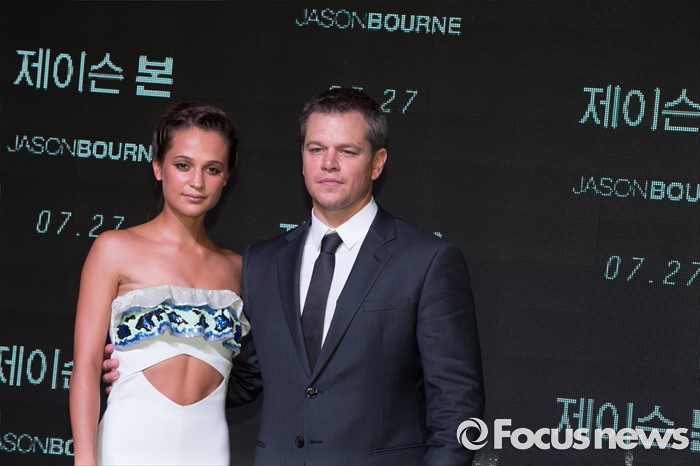 (서울=포커스뉴스) 8일 오후 서울 영등포구 타임스퀘어에서 열린 영화 '제이슨 본' 레드카펫 행사에 참석한 배우 알리시아 비칸데르(왼쪽)과 맷더이먼이 포즈를 취하고 있다.