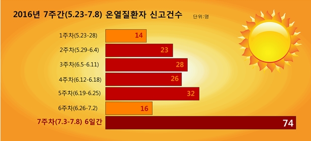 감시체계 운영이후 지난 일주일(7월3일~7월8일)동안 온열질환자 수는 74명으로 지난 주까지(5월23일~7월2일)에 비해 약 3배가 증가했다.