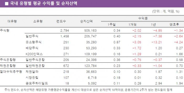 유형별로는 중소형주식펀드가 0.87%의 수익률로 국내 주식형펀드 중 가장 우수한 성과를 보였다. 일반주식펀드와 배당주식펀드도 각각 0.40%, 0.33% 상승했다. 반면에 K200인덱스펀드는 대형주 약세로 0.16% 상승하는데 그쳤다.